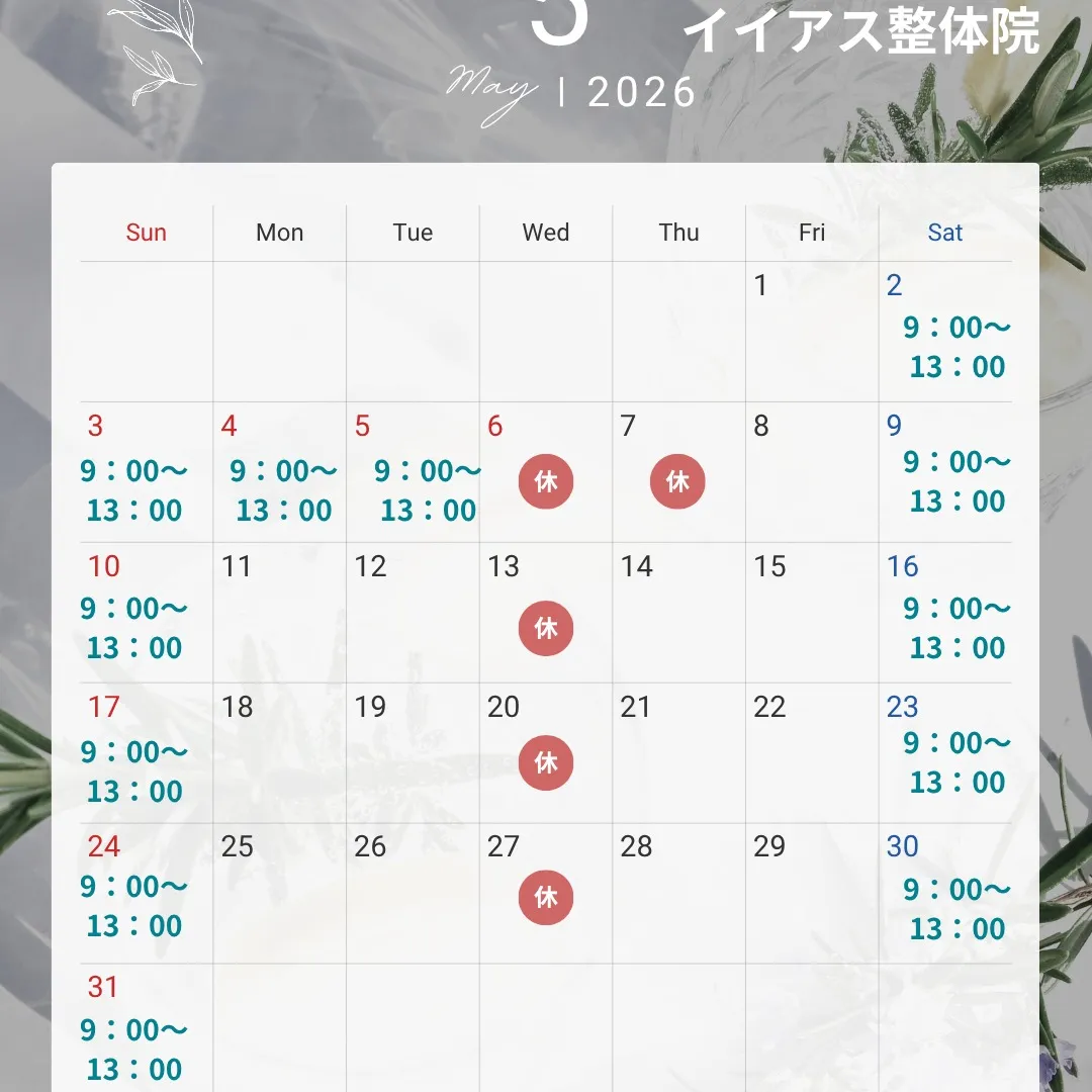 おはようございます!イイアス整体院です。5月の営業日について、お知らせがありますので、ご確認くださいね。まず、6日(水)と7日(木)は臨時休診させていただきます。